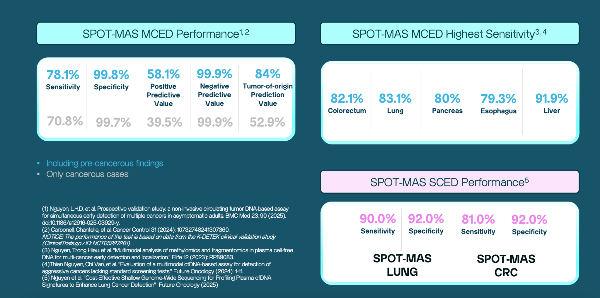 (1) Nguyen, et al., 2025. “Prospective validation study: a non-invasive circulating tumor DNA-based assay for simultaneous early detection of multiple cancers in asymptomatic adults.” BMC Medicine 23, 90. https://doi.org/10.1186/s12916-025-03929-y