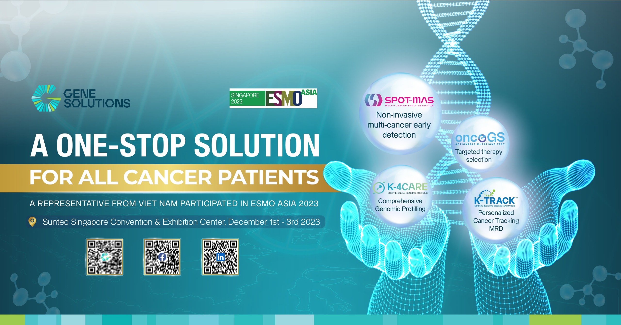 Present at ESMO ASIA 2023, Gene Solutions hopes to introduce its significant achievements in Next-generation sequencing – NGS, providing a significant step forward in personalized medicine in cancer treatment. With products like SPOT-MAS, OncoGS, K-TRACK, K-4CARE, Gene Solutions has been at the forefront of applying cell-free DNA technology to support screening, diagnosis, guilding and monitoring treatment for various types of cancer.