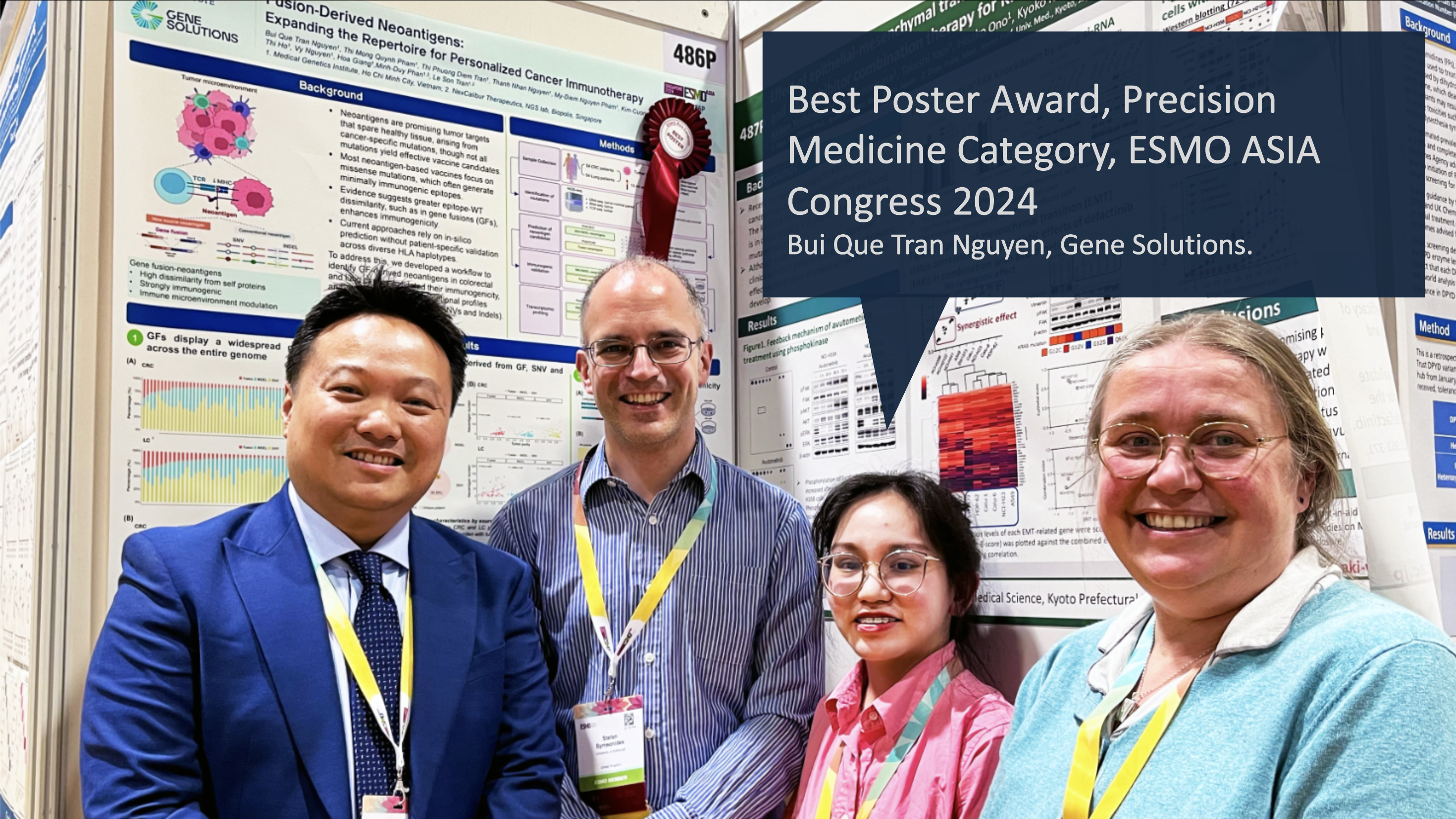 Singapore, 30 Dec 2024 – Gene Solutions, a pioneering biotech company in Asia, announced that Bui Que Tran Nguyen, a young scientist from its cancer vaccines R&D team, received the prestigious Best Poster Award in the Precision Medicine category at the European Society of Medical Oncology (ESMO) Asia Congress 2024. This recognition underscores the potential of Gene Solutions’ innovative research to significantly impact cancer treatment advancements.