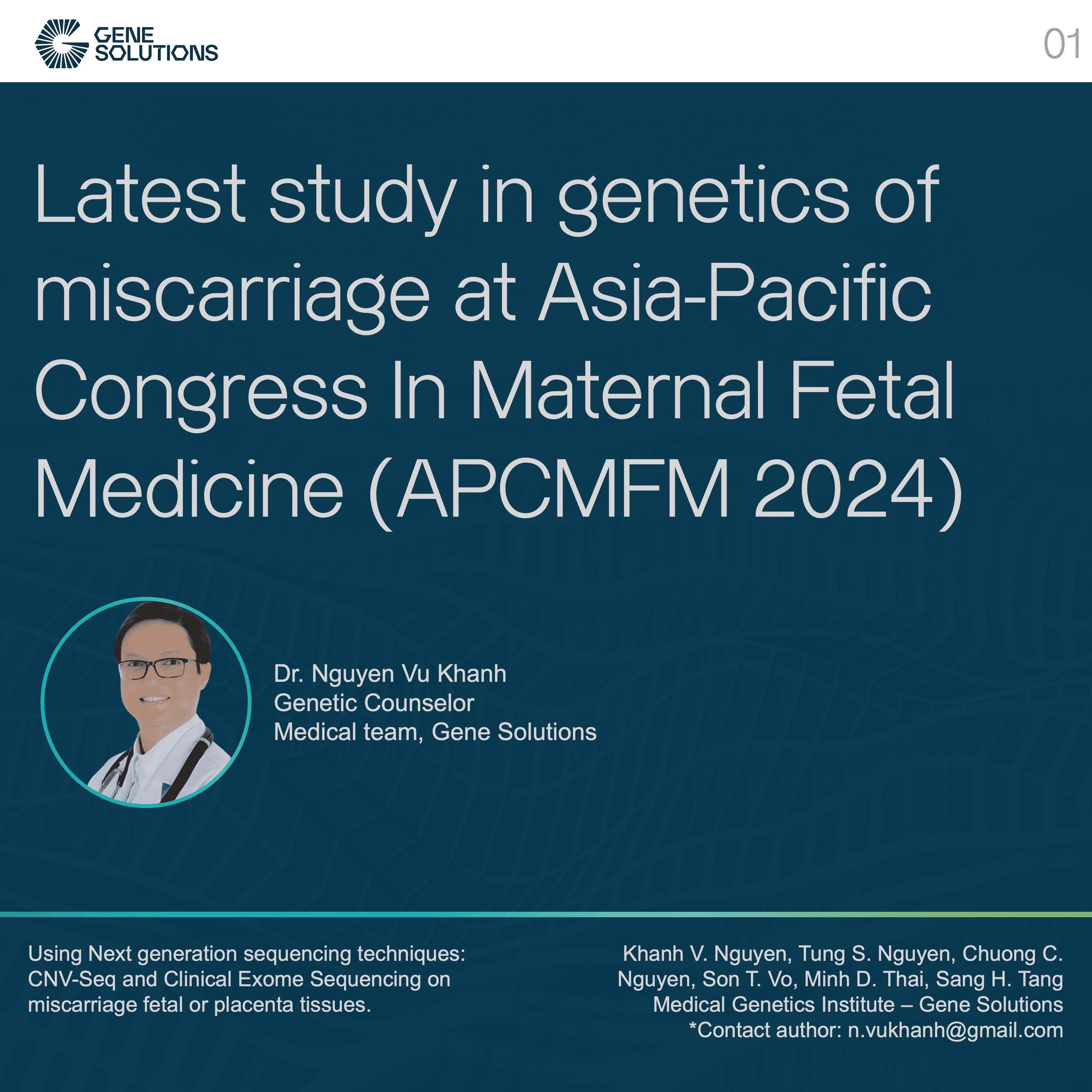 We are proud to announce that Dr. Nguyen Vu Khanh and Dr. Nguyen Son Tung from Gene Solutions attended and presented important findings in the genetics of miscarriage at the 17th APCMFM 2024.