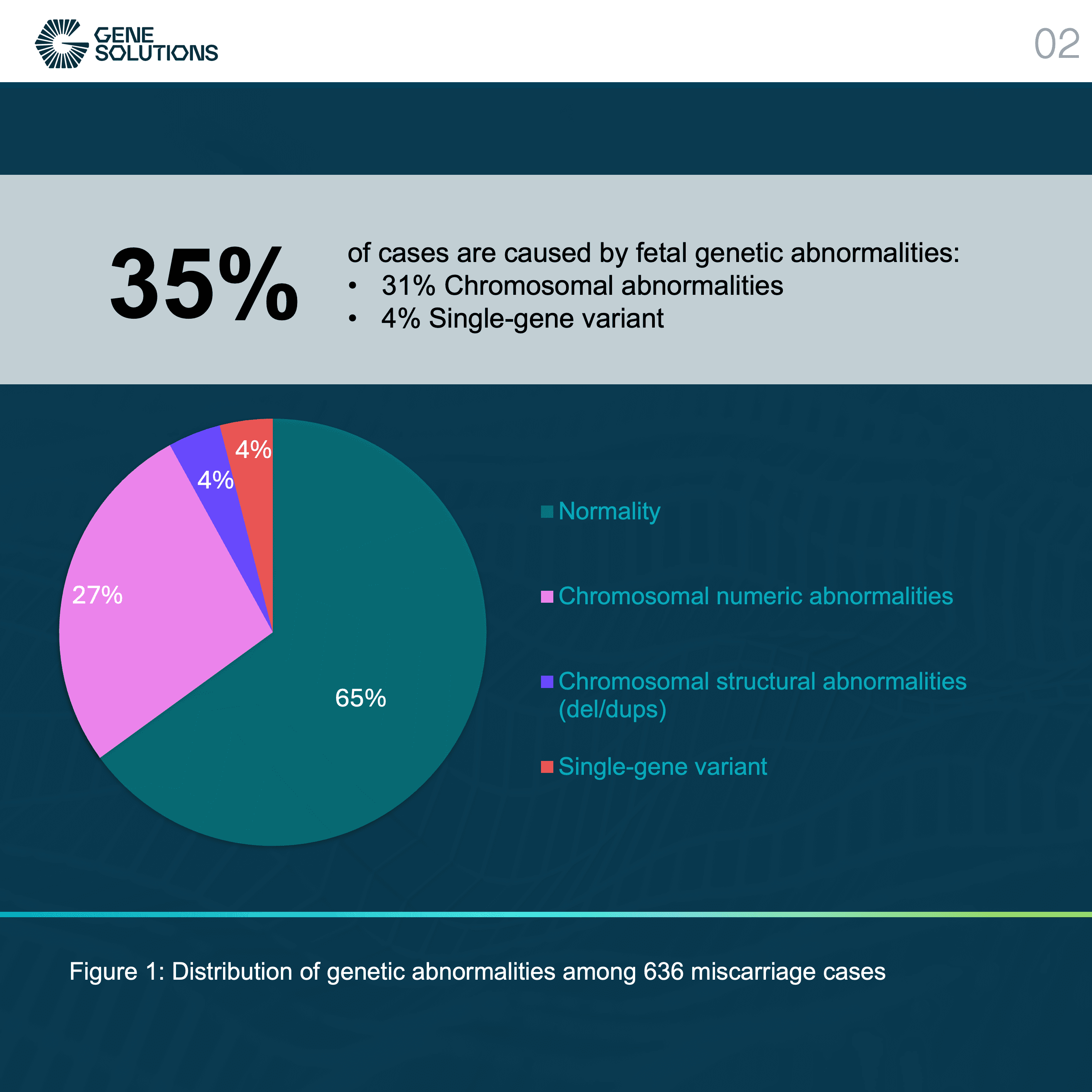 In 636 pregnancy loss cases, the study identified 223 cases with genetic abnormalities (96% chromosomal abnormalities and 4% single-gene variants). Chromosomal abnormalities are common genetic factors causing miscarriage. Identifying new genetic variations through this research may provide valuable insights into the molecular mechanisms leading to fetal demise. It provides reference data for the diagnosis and prevention of miscarriage.