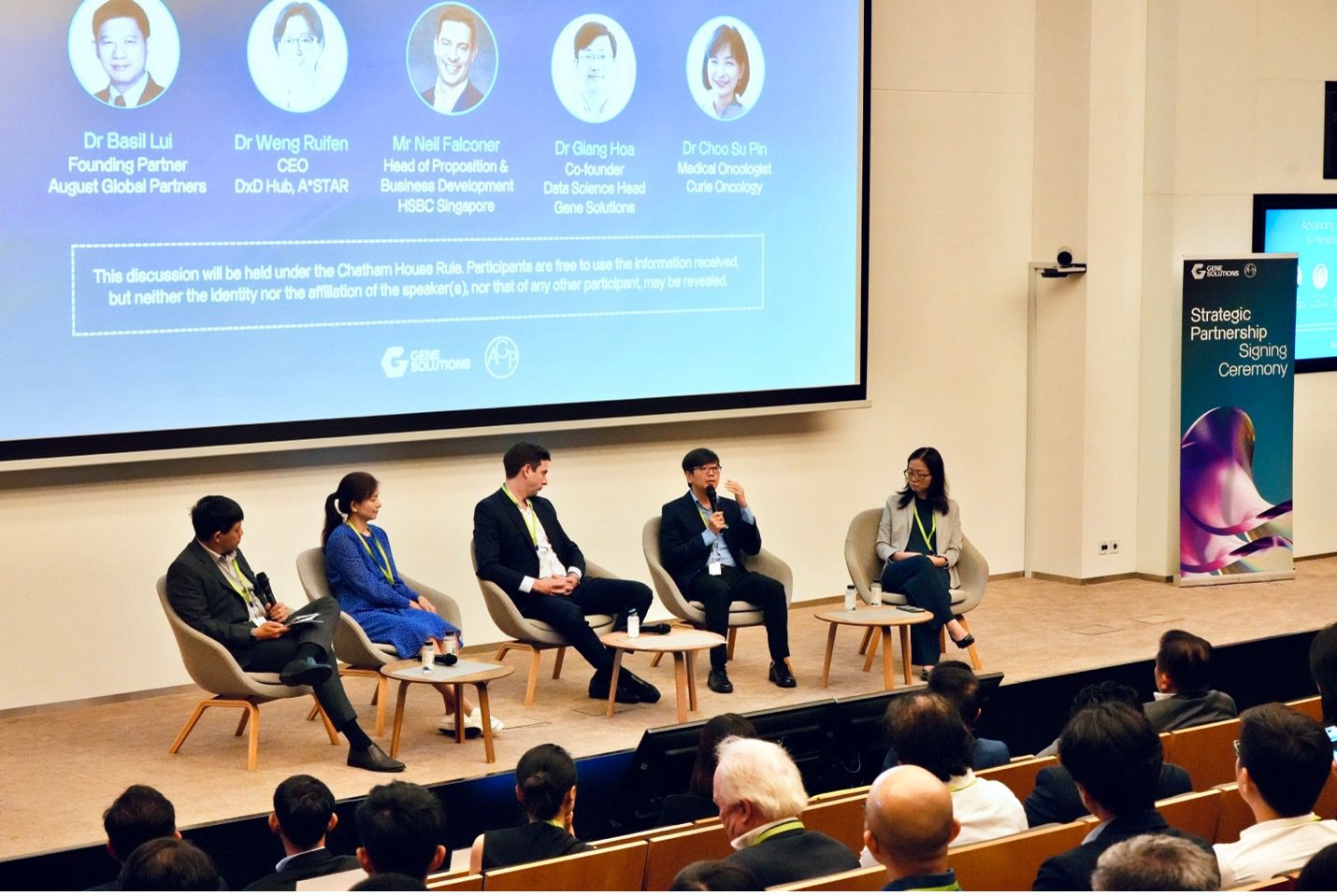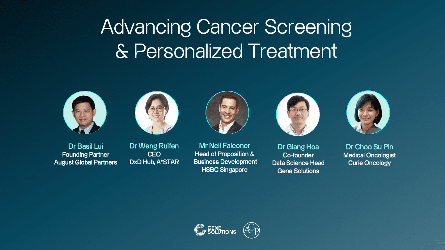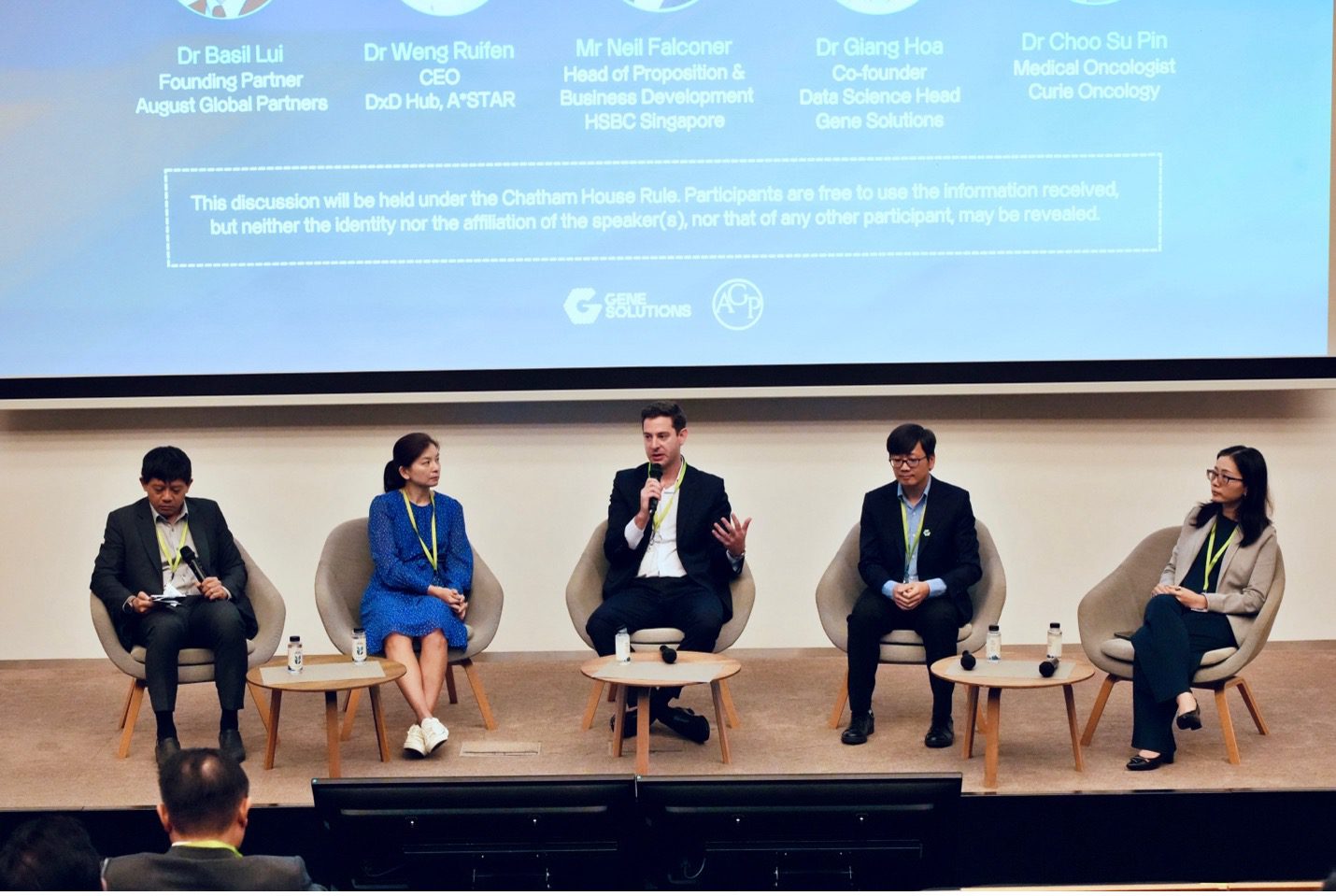 Dr. Basil Lui, Founding Partner at AGP moderated a vibrant discussion with four panelists: Dr. Choo Su Pin, Medical Oncologist at Curie Oncology, Singapore; Dr. Weng Ruifen, CEO at DxD Hub (a national platform hosted by A*STAR), Singapore; Dr. Giang Hoa, Data Science Head at GS; and Mr. Neil Falconer, Head of Proposition and Business Development at HSBC Singapore.